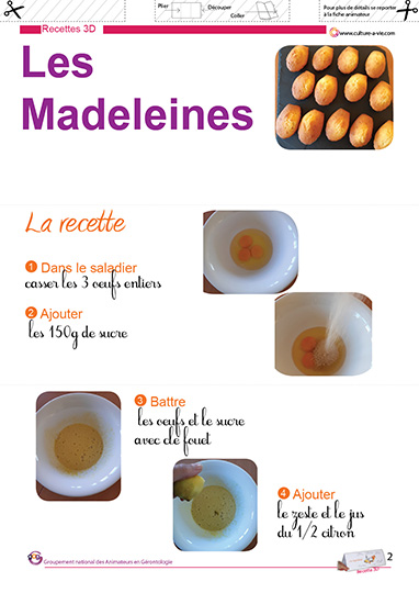 Caroline propose cette recette de madeleines en complément du support déjà sur CULTUREàVIE dédié à la madeleine de Proust qui est composé de l’explication de l’expression « la madeleine de Proust » est prolongé par un extrait du livre et une biographie de Proust (à retrouver en tapant « Proust » dans l’espace recherche). La recette de Caroline a été mise en page selon le concept des recettes « 3D » de CULTUREàVIE. Elles sont à imprimer et à assembler en pupitre pour ne laisser apparaître qu’une étape à la fois. Le triangle pupitre imaginé pour les recettes permet d’avoir à portée de vue seulement l’étape en cours. Il tourne au fur et à mesure des étapes. La recette est très facile à réaliser.