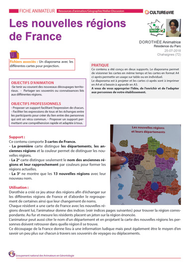 Ce support permet à travers différentes cartes de France, de découvrir le nouveau découpage des 13 régions de France. Des indices ont été créés par Dorothée, pour apporter une dimension ludique pour faire découvrir ces nouveaux territoires. Ce contenu propose les cartes en version diaporama à projeter et en format A4 à imprimer. N’oubliez pas de « dézipper » le diaporama avant de le projeter.