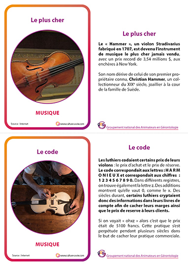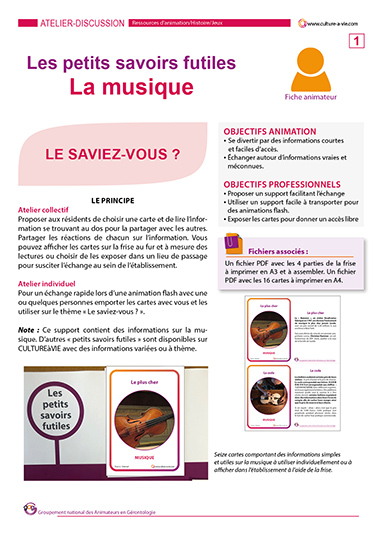 A l’occasion de la fête de la musique, 16 cartes proposent des petites informations simples et ludiques pour passer un moment d’échanges autour de la musique. Des informations sur des cartes à partager en animation individuelle ou collective. Un support de frise pour installer les cartes peuvent transformer cette animation pour personnes âgées en exposition.