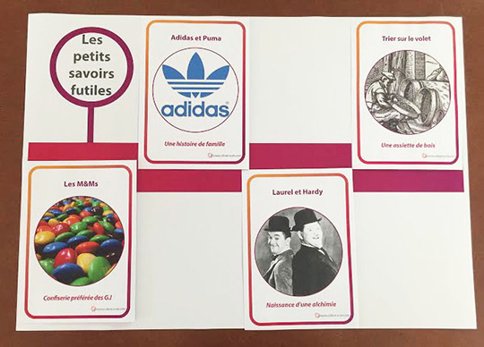 16 cartes proposent des petites informations simples et ludiques pour passer un moment d’échanges autour de sujets légers. Les sujets abordés sont liés aux grandes marques, à des personnages célèbres, au corps humain et à des expressions. Des informations vraies mais insolites sur des cartes à partager en animation individuelle ou collective. Ce support nommé « Petits savoirs futiles3 » fait suite à deux premiers déjà en ligne à retrouver dans le menu Ressources d’animation/Histoire/jeux.