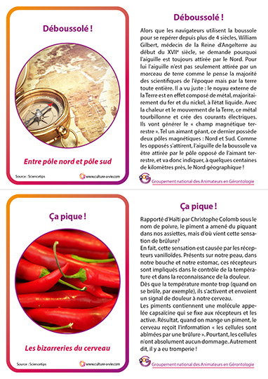 16 cartes proposent des petites informations simples et ludiques pour passer un moment d’échanges autour de sujets légers. Les sujets abordés sont liés à la nature. Des informations vraies mais insolites sur des cartes à partager en animation individuelle ou collective.