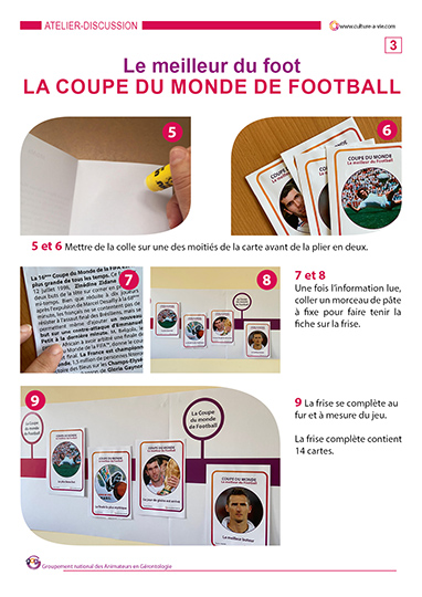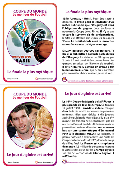 14 cartes proposent des petites informations simples et ludiques pour passer un moment d’échanges autour de la Coupe du Monde de Football. Des informations sur des cartes à partager en animation individuelle ou collective. Un support de frise pour installer les cartes peuvent transformer cette animation pour personnes âgées en exposition.