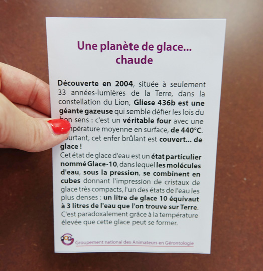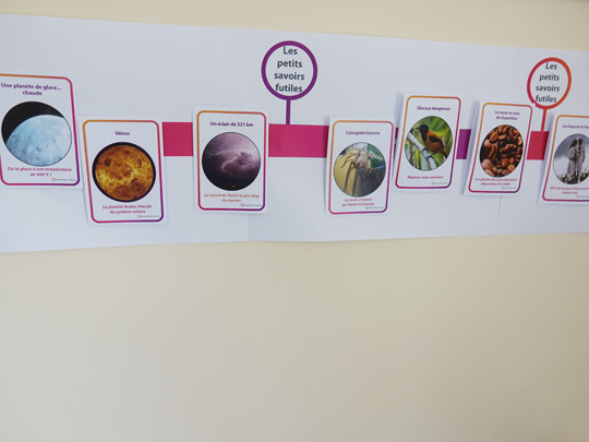 16 cartes proposent des petites informations simples et ludiques pour passer un moment d’échanges autour de sujets légers. Les sujets abordés sont l’espace, la nature, les animaux et la population. Des informations vraies mais insolites sur des cartes à partager en animation individuelle ou collective. Ce support nommé « Petits savoirs futiles2 » fait suite à un premier sur les animaux et les célébrités mis en ligne en avril 2018.