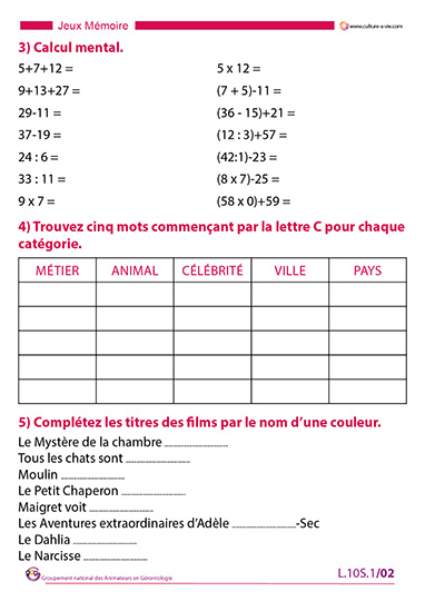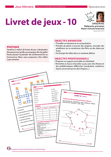 Pour aider les personnes qui restent en chambre à se divertir, Sandrine a créé de nombreux livrets de jeux mémoire à imprimer. Nous vous proposons d’en retrouver 1 chaque semaine (13 livrets en tout) regroupant 2 séries de jeu. Les jeux proposés font appel aussi bien à la culture générale qu’à la logique et la concentration.