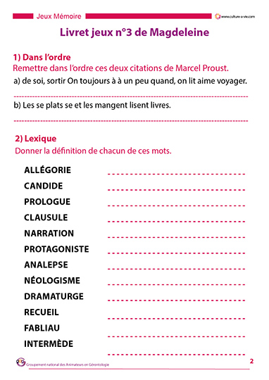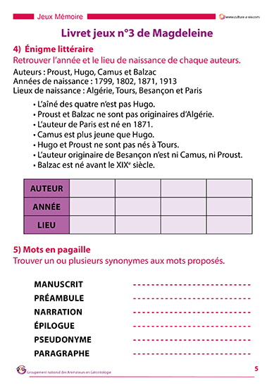 Pour se divertir seul ou en petit groupe, propose une série de jeux littéraires. Les jeux proposés font appel aussi bien à la culture générale qu’à l’observation et la concentration. Ce livret s’adresse aux personnes ayant de bonnes connaissances littéraires. Ce contenu d’animation jeux à imprimer est le 3e proposé par Magdeleine.