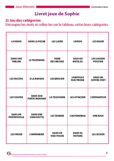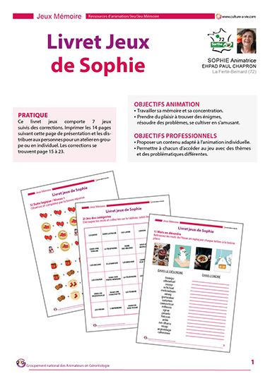 Pour aider les personnes qui restent en chambre à se divertir, Sophie propose une série de jeux faisant appel à différentes mémoires et connaissances. Ce contenu est adapté à l’animation individuelle.