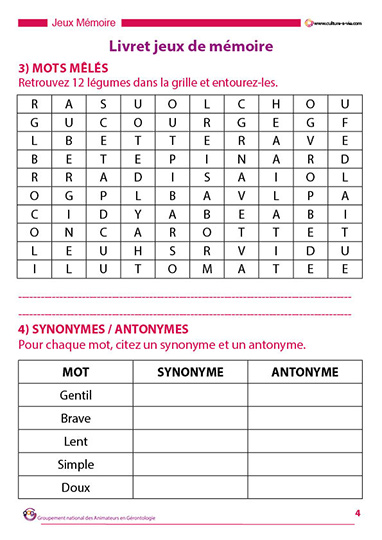 Ce support d’animation destiné aux personnes âgées regroupe 10 jeux permettant de se creuser les méninges. Les questions portent essentiellement sur des exercices en lien avec la langue française. Ici, pas de calculs. Le niveau est assez facile, à vous de proposer ce support en fonction des capacités de votre public.