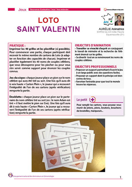 Aurélie propose un loto dédié aux couples célèbres pour fêter la Saint Valentin. Vous retrouvez 20 couples célèbres répartis sur les grilles, dont Roméo et Juliette, Bonnie et Clyde, Prince Charles et Lady Di et bien d’autres ! Un bon support pour allier jeu et fête.