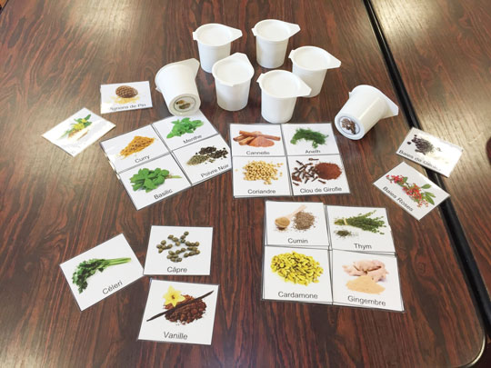 Sur le même principe que le loto traditionnel, Thomas a remplacé les chiffres par des images d’épices et d’aromates. Les mêmes ingrédients ont été placés dans des pots afin que chaque joueur les retrouve par l’odorat et la vue et le place sur son carton de loto.