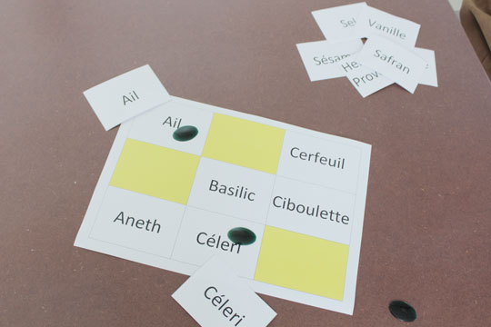 Sur le même principe que le loto traditionnel, Angélique a remplacé les chiffres par des herbes aromatiques. Des fichiers préparés vous permettent d’imprimer les cartes de loto ainsi que les vignettes des 40 herbes choisies pour le tirage. Une fiche explicative vous permettra de lancer la discussion sur chaque herbe et de partager les secrets de chacun sur leurs vertus.