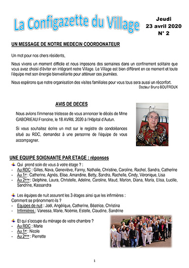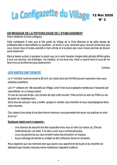 Afin de développer un moyen de communication interne malgré le confinement en chambre, Delphine a mis en place depuis le premier confinement une gazette de l’établissement distribuée dans les chambres. Elle y parle de la vie de la structure mais également d’informations liées à la situation sanitaire afin d’éclairer les résidents sur les mesures actualisées pour leur maison d’hébergement. Trois exemples de configazette sont à télécharger en plus du partage d’expérience pour vous guider.