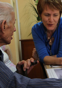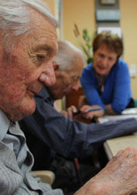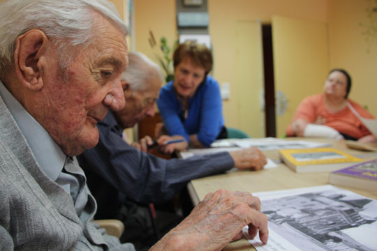 Joëlle a travaillé pendant plusieurs ateliers autour des vues d’hier et d’aujourd’hui avec ses résidents. Des cartes postales anciennes imprimées en grand ont permis à chacun d’évoquer son quartier, les commerces, les marchés. La confrontation des cartes postales avec des photos récentes invitait chacun à poursuivre les échanges sur les changements opérés au sein de leur ville.