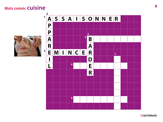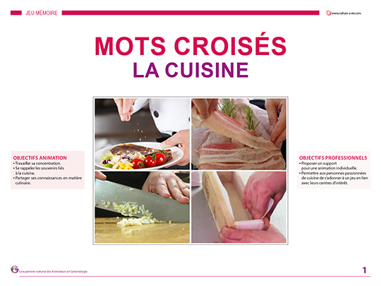 Ce diaporama mots croisés cuisine peut être visionné sur un ordinateur pour un travail en binôme avec la personne âgée ou en groupe mais également en activité individuelle en imprimant les feuilles pour la personne. Appareil, fouetter, chemiser, assaisonner, au total 8 termes culinaires sont à retrouver dans ce jeu de mots croisés. Les amateurs de cuisine devraient retrouver à travers ce jeu de beaux souvenirs à se remémorer et à partager.
