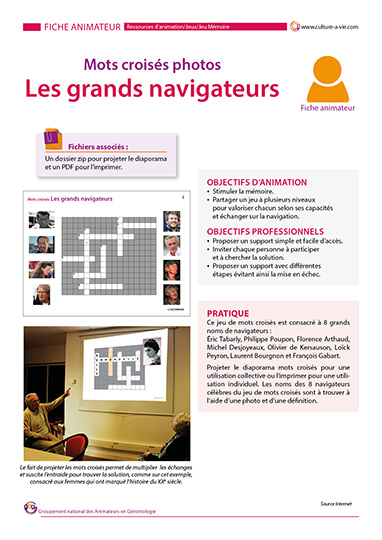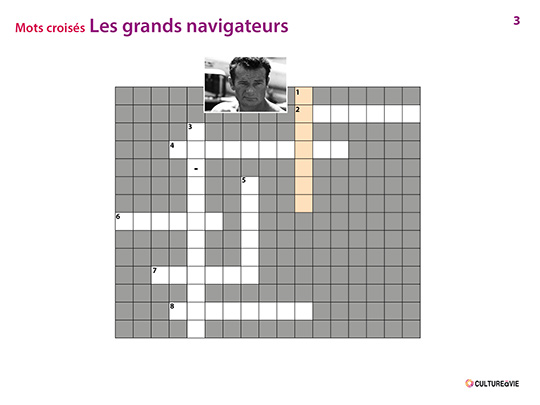 Un jeu de mots croisés photos consacré à de grands navigateurs. Une version diaporama pour participer à plusieurs est disponible. La grille se remplie au rythme des indices et du niveau de chacun. Agrémenté d’une photo et d’un indice sur le parcour du navigateur. Ce jeu peut être collectif en le projetant ou individuel en l’imprimant. N'oubliez pas de "dezipper" le diaporama avant de le lancer.