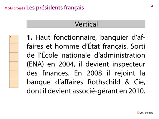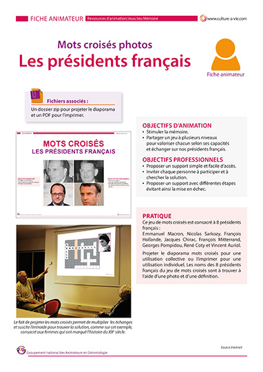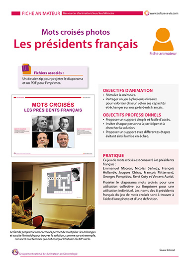 L’année 2021 marque le 40e anniversaire de l’accession de François Mitterrand à la présidence de la République. Ce jeu de mots croisés photos est consacré à 8 présidents français. Une version diaporama pour participer à plusieurs est disponible. La grille se remplie au rythme des indices et du niveau de chacun. Agrémentée d’une photo et d’un indice sur chaque président. Ce jeu peut être collectif en le projetant ou individuel en l’imprimant. N'oubliez pas de "dezipper" le diaporama avant de le lancer.