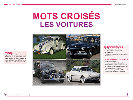 Ce diaporama mots croisés voiture peut être visionné sur un ordinateur pour un travail en binôme avec la personne âgée ou en groupe mais également en activité individuelle en imprimant les feuilles pour la personne. De la coccinelle à la Dauphine en passant par la traction, 8 autos sont à identifiées pour que les amateurs de belles cylindrées retrouvent à travers ce jeu de beaux souvenirs à se remémorer et à partager.
