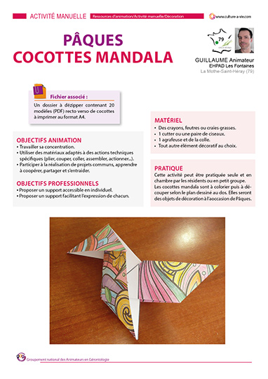 Guillaume propose une activité manuelle à pratiquer seule en chambre ou en petits groupes. La réalisation de ces « cocottes mandala » mènera les résidents à se concentrer et à travailler la motricité à travers des actions bien spécifiques telles que colorier, couper, plier, coller, assembler…