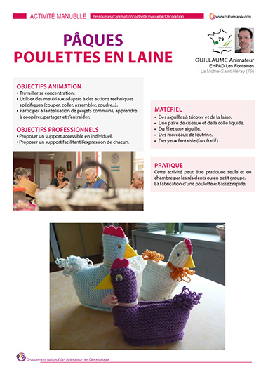Guillaume propose une activité manuelle à pratiquer seule en chambre ou en petits groupes. La réalisation de ces « Poulettes en laine » mènera les résidents à se concentrer et à travailler la motricité à travers des actions bien spécifiques telles que couper, plier, assembler, coudre…