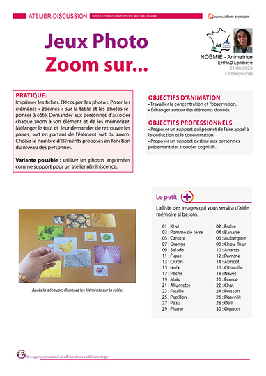 Noémie propose un jeu-mémoire reposant sur une quinzaine d’images zoomées à assembler à leurs jumelles non zoomées. Ce jeu est idéal pour stimuler la mémoire visuelle et la concentration. Ce contenu d’animation est adapté pour les personnes présentant des troubles cognitifs type Alzheimer.