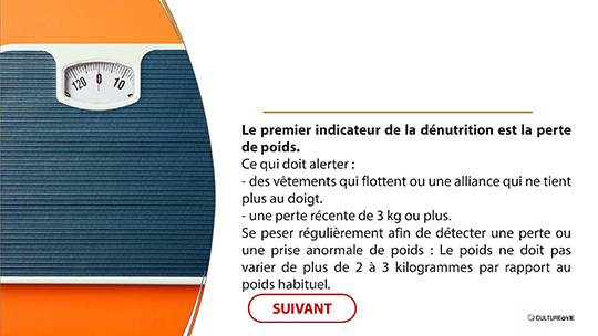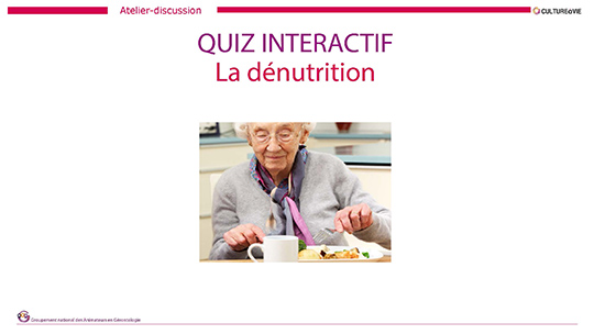 Marie Jo, infirmière, propose une série de diapositives-quiz interactif sur la dénutrition. Il existe beaucoup d’idées reçues sur l’alimentation chez les personnes âgées : certains pensent en effet que les besoins diminuent avec l’âge. Ce quiz est un moyen ludique d’apporter des connaissances, d’expliquer simplement comment l’alimentation est importante dans la vie de nos ainés. Des conseils sont également donnés à la fin de ce support.