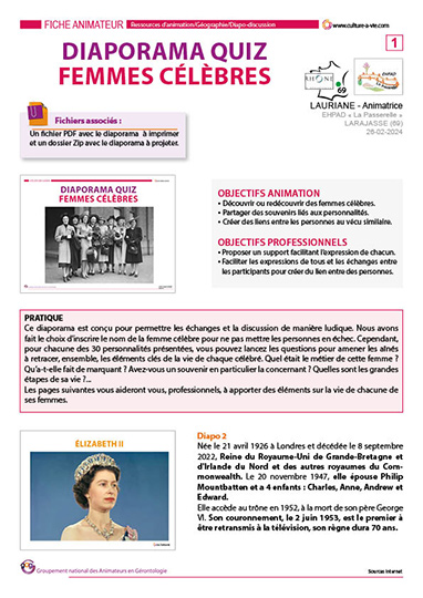 A l’occasion de la journée de la femme Lauriane propose un contenu permettant de projeter des photos de femmes connues. Le concept est simple, les personnes âgées échangent afin de se remémorer le plus d’éléments possible sur la vie de la célébrité présentée. La fiche animateur permet d’apporter ou de valider des informations données par les résidents.