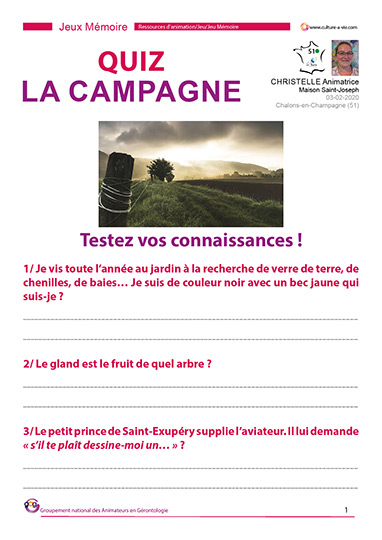 Le quiz proposé par Christelle permet aux personnes issues de la campagne d’échanger sur leurs connaissances et leurs anciennes pratiques par le jeu. Composé de 40 questions, ce support d’animation est composé de 2 versions. La première comporte les questions avec un espace pour écrire les réponses et une version avec la question, la réponse et une photo associée. Vous pouvez également imprimer seulement la 2e version et jouer à l’oral.