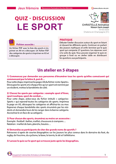 Christelle propose un support d’animation qui se déroule en plusieurs étapes. L’atelier mémoire autour du sport débute par un échange autour des différents sports et des grands sportifs avant de terminer par un quiz de culture générale sur le sport. Les fichiers annexes au quiz vous permettront de lister visuellement les sports et leurs catégories.