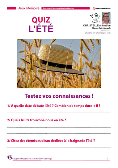 Le quiz proposé par Christelle permet d’échanger sur l’été. Composé de 25 questions et 6 devinettes, ce support d’animation est proposé en version à imprimer. Certaines questions font appellent aux connaissances et d’autres aux souvenirs ou expériences des personnes âgées. La première partie comporte les questions avec un espace pour écrire les réponses et la seconde partie comporte la question et la réponse. Vous pouvez également imprimer seulement la 2e version et jouer à l’oral en individuel.