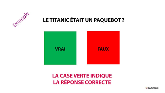 Ce quiz à projeter permettra de retrouver l’histoire de ce paquebot d’une manière interactive. En mode diaporama, pour chaque question posée, des propositions sont données, les personnes devront trouver la bonne réponse. Créé sous forme de QCM, la réponse à chaque question s'affiche en vert en un clic (il faut cliquer sur les réponses proposées pour découvrir la bonne réponse qui s'affiche en vert). Ce quiz composé de 32 diapositives apportera des connaissances supplémentaires ou complémentaires à chacun. Et pour ceux qui ont participé au diaporama « Histoire du Titanic » paru en mai, cela peut être un moyen de se souvenir des informations données lors de cette projection.
