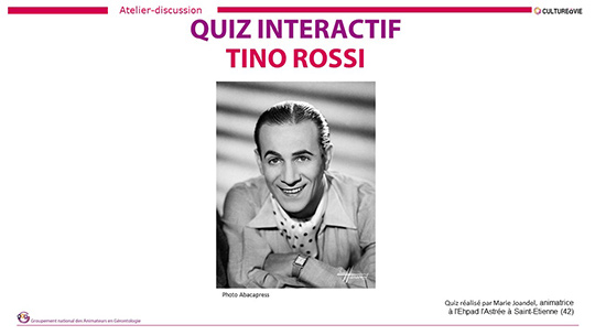 A l’heure des fêtes de Noël, difficile de ne pas chanter la chanson culte du petit papa noël et de parler de son interprète. Marie, animatrice, propose un quiz à projeter. Il permettra de retrouver des informations concernant la vie de Tino Rossi d’une manière interactive. Pour chaque question posée, des propositions sont données, les personnes devront trouver la bonne réponse. Créé sous forme de QCM, la réponse à chaque question s'affiche en vert en un clic (il faut cliquer sur les réponses proposées pour découvrir la bonne réponse qui s'affiche en vert). Ce quiz composé de 26 diapositives apportera des connaissances supplémentaires ou complémentaires à chacun.