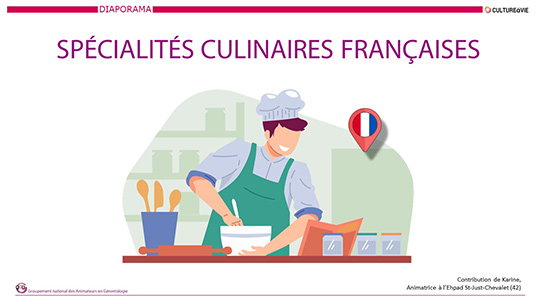 Ce diaporama permet un voyage culinaire en France. Chaque diapositive invite par un jeu de questions/réponses à se rappeler un plat ou une variété de produits culinaire. Cette activité est un moyen de réviser sa géographie, de découvrir des spécialités méconnues et de faire une comparaison ou trouver une similitude avec des plats cuisinés par les aînés.