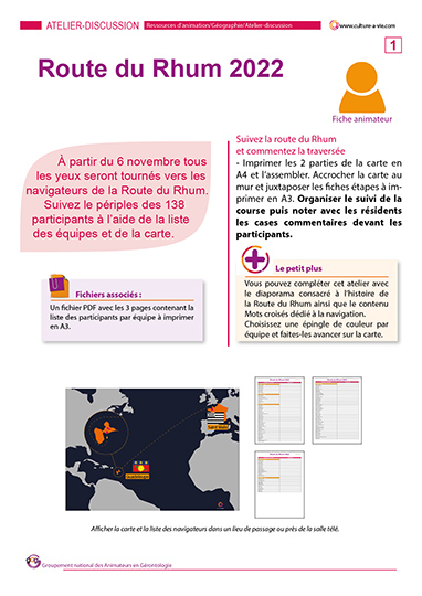 Ce support vous permettra de suivre en direct la course de la Route du Rhum 2022. Il contient la carte à assembler et la liste des navigateurs répartis par équipe. Affichés dans un lieu propice au suivi de la course, ces supports vous permettront de noter l’avancée de chacun dans la case « commentaires ».
