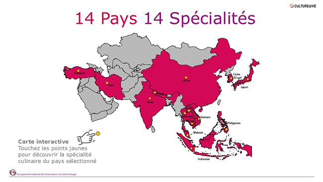 Après un contenu similaire sur les spécialités culinaires d’Europe, celles d’Afrique, et celles d’Amérique du Nord, ce diaporama permet un voyage culinaire à l’aide d’une carte d’Asie interactive. Il suffit de cliquer sur l’un des 13 pays colorés en rose pour ouvrir une diapositive où se trouve le nom d’une spécialité du pays, la photo du plat, les ingrédients qui le constituent et comment il est cuisiné. Cette activité est un moyen de réviser sa géographie, de découvrir des spécialités méconnues et de faire une comparaison ou trouver une similitude avec des plats cuisinés par nos ainés.