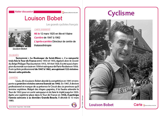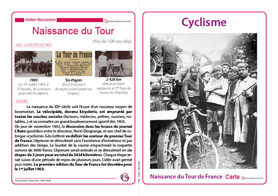 Un diaporama reprenant les grands moments du cyclisme de la naissance du tour aux cols mythiques en passant par les grands coureurs qui ont marqué ce sport. Des cartes détaillant l’histoire du cyclisme viendront compléter vos ateliers discussions que vous pourrez mettre en avant à l’aide de l’affiche et des invitations jointes.