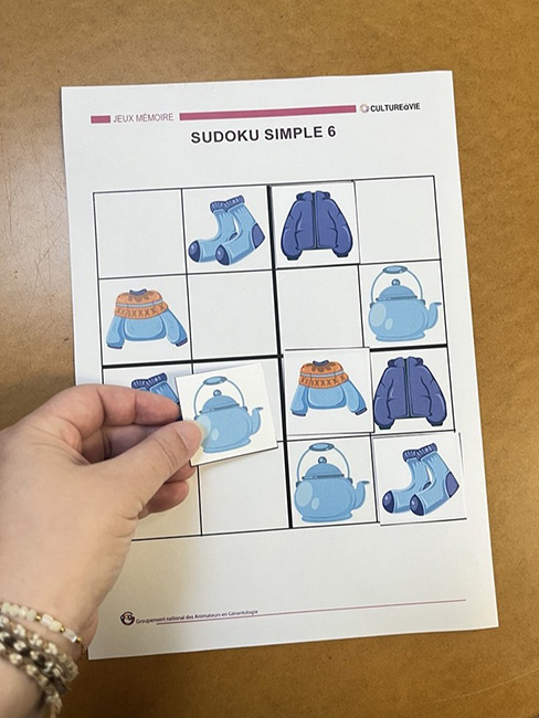 Ce jeu de sudoku simplifié est spécialement conçu pour les personnes âgées. Il propose des grilles 4x4 accessibles, illustrées de pictogrammes sur le thème de l’hiver. Idéal pour stimuler la mémoire et la logique tout en s'amusant, ce support comprend 2 niveaux de difficulté avec 6 grilles chacun. Ludique, coloré et facile à prendre en main, il favorise la concentration et l’échange. Une activité parfaite pour des ateliers de détente individuelle ou des temps calmes en petit groupe, à la fois cognitifs et récréatifs.