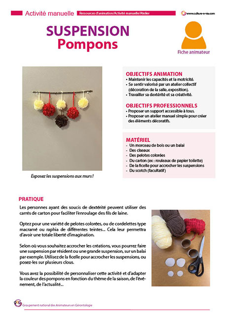 Cette activité consiste à confectionner une suspension de pompons qui valorisent la dextérité et la minutie. La fiche méthode permet de suivre étape par étape la confection. Vous avez la possibilité de personnaliser cette activité en fonction du thème abordé, de la saison, de l’événement...