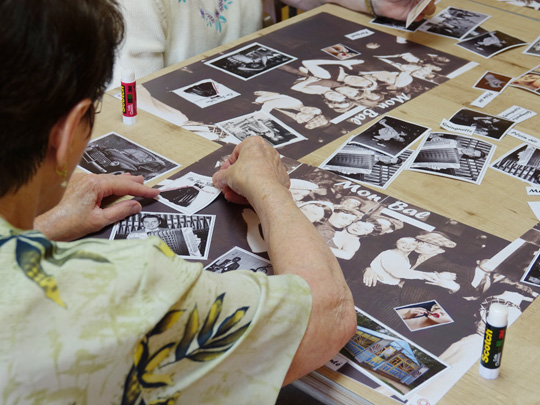 Cette animation s’appuie sur des images et un support à composer facilitant les échanges, les anecdotes et les souvenirs. Chaque personne dispose d’un support de fond vierge et des photos sont proposées au centre de la table. Chacun leur tour les résidents vont choisir une image en lien avec le thème proposé, ici le cinéma (films, matériel, salles…) et justifier de leur choix par un vécu (avec qui j’allais au cinéma, qui projetait, dans quelle salle…). Au fur et à mesure des tours de table « le cinéma » de chacun va prendre forme. Les résidents sont ensuite libres de repartir avec et de le partager avec leur entourage ou de le laisser pour créer une exposition. Ce concept de « Tranche de vie » est décliné sous d’autres thèmes. Vous pouvez les retrouver dans le menu ressources d'animation/Communiquer sur soi