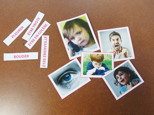 Ce support, composé de mots et d’images, permet de mettre des mots sur des émotions ressenties à partir de photos. Sophie utilise ce support pour des personnes présentant des troubles cognitifs type Alzheimer. Ce support est également composé d’un trombinoscope des émotions qui permet de questionner la personne sur son état d’esprit avant et après l’atelier.