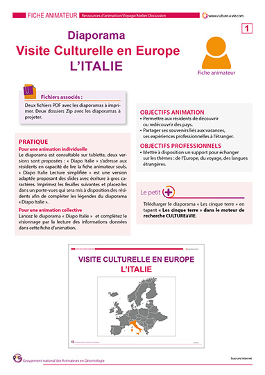 Ce diaporama accompagné de sa fiche animateur permet aux résidents de découvrir ou redécouvrir l’Italie, ses monuments incontournables et ses traditions afin de voyager un peu… N’oubliez pas de « dezipper » les diaporamas avant de les lancer en faisant un clic droit « extraire tout ».