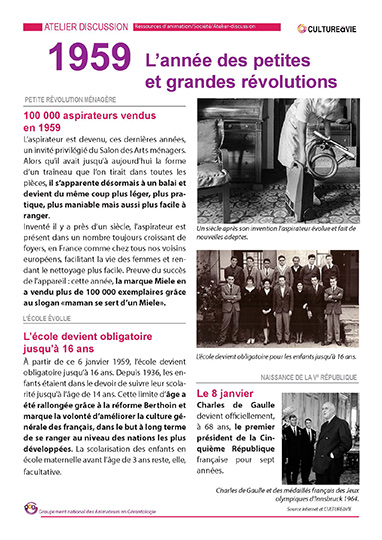1959 : l’arrivée de la Ve République, la naissance de la poupée Barbie, l’école obligatoire jusqu’à 16 ans… autant de faits marquants connus des résidents. Une fiche détaillant tous les faits marquants de cette année de 1959 vous permettra de lancer la discussion autour des années 50 en invitant chaque résident à partager ses souvenirs ou à donner son fait marquant.