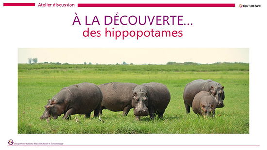 Ce diaporama, accompagné de sa fiche animateur, vous emmène à la découverte de l’hippopotame. Ses caractéristiques avec quelques infos insolites, des vidéos, un quiz et de belles images à imprimer pour continuer la discussion dans la structure autour de cet animal impressionnant. Le diaporama est disponible en format PDF mais il ne contient pas les vidéos.