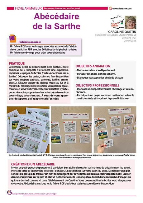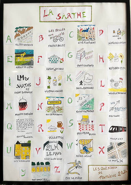 Cette exposition créée sous la forme d’un abécédaire est consacrée à la Sarthe. Réalisé par les résidents de la structure de Caroline, il est mis à disposition pour les structures du département et pour les autres la fiche animateur et un fichier Word vous permettra de créer votre propre abécédaire.