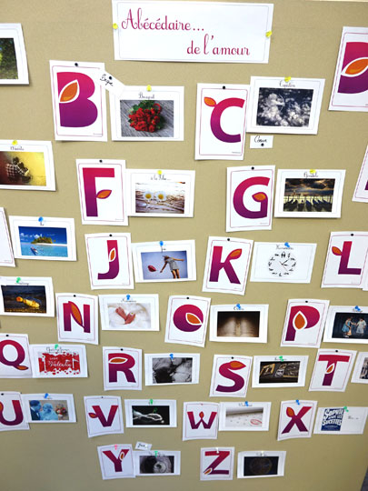 Ce contenu sur le thème de l’amour a été créé pour être utilisé, entre autre, à l’occasion de la Saint-Valentin le 14 février. Les 26 lettres de l’alphabet correspondent à autant de mots commençant par chaque lettre en lien avec le thème de l’amour et les images (bouquet, cupidon, diamant, étreinte…). L’idée de ce support est de passer en revue chaque lettre en faisant trouver des mots sur le thème proposé avant d’amener les personnes à y associer un souvenir, un point de vue ou une anecdote. Assembler ensuite les lettres et les images pour former une exposition sur le thème de l’amour.