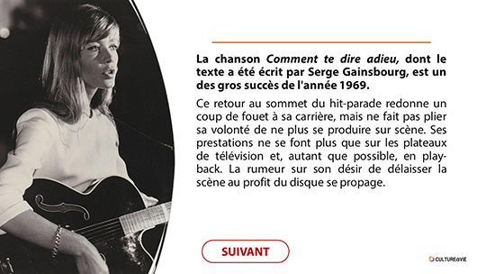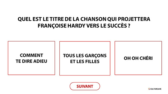 Elle était une icône de la chanson française. Françoise Hardy est décédée à l'âge de 80 ans, a annoncé son fils Thomas Dutronc, mardi 11 juin 2024. Autrice, interprète et compositrice, elle a offert à son public 28 albums en près de 60 ans de carrière. De 1962 à 2018, elle a chanté la mélancolie, l'amour et le temps qui passe. Le diaporama proposé ici permet de retrouver les grandes étapes de sa vie à travers des questions suivies de réponses à choix multiples.