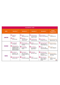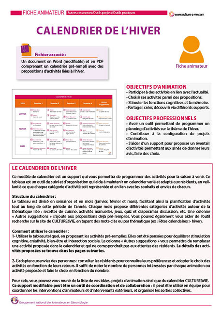 Prérempli pour les mois d’hiver, ce calendrier à imprimer présente 24 contenus d’animations. Il servira à mettre en place des ateliers discussion ou activités manuelles où les participants pourront s’exprimer sur le thème de l’hiver et des fêtes associées à cette période. Ce support modifiable peut être personnalisé selon les envies de chacun. Ce tableau est un outil de recueil et d’organisation qui aide à maintenir un calendrier varié et adapté aux attentes des résidents, en veillant à ce que chaque catégorie d’activité soit représentée et en lien avec les souhaits et envies de chacun.