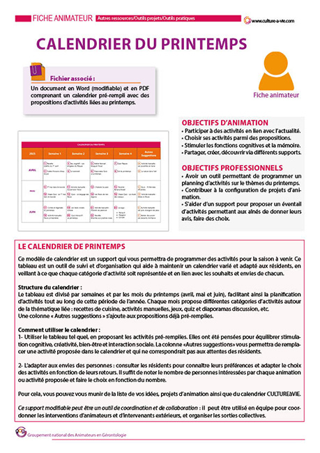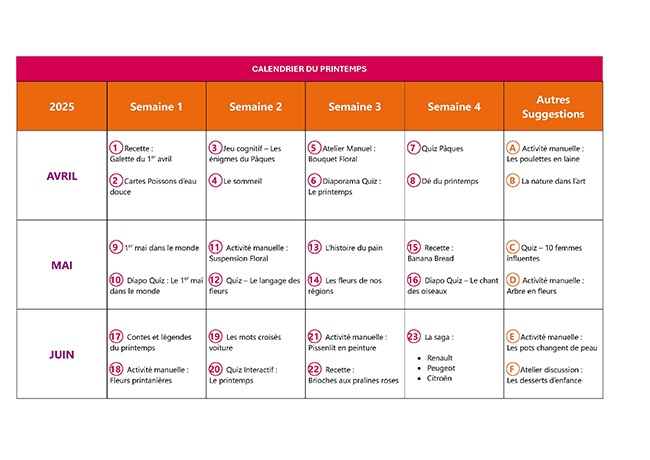 Prérempli pour les mois du printemps, ce calendrier à imprimer présente 15 contenus d’animations. Il servira à mettre en place des ateliers discussions ou activités manuelles où les participants pourront s’exprimer sur le thème du printemps. Ce support modifiable peut être personnalisé selon les envies de chacun. Ce tableau est un outil de recueil et d’organisation qui aide à maintenir un calendrier varié et adapté aux attentes des résidents, en veillant à ce que chaque catégorie d’activité soit représentée et en lien avec les souhaits et envies de chacun.