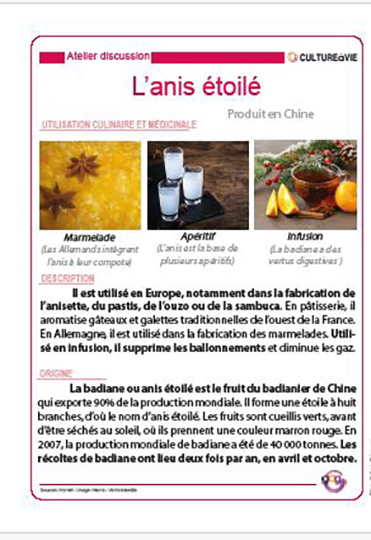 Anis étoilé, safran, basilic, romarin, les épices et les aromates font partis de notre patrimoine culinaire. Des cartes détaillant l’origine et la description des produits permettent de lancer un atelier-discussion sur les souvenirs de chacun liés à ses odeurs et ses saveurs si particulières.