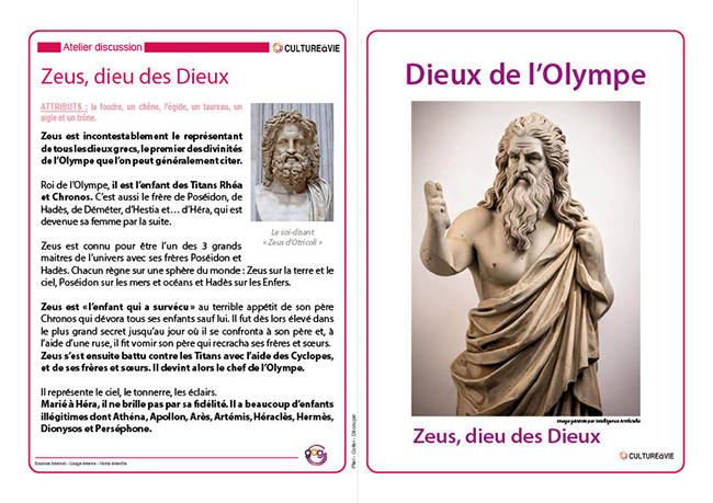 Ce support comporte des cartes d’identité des 14 principaux dieux et déesses grecs. Sur chacune d’entre elles, vous retrouverez de nombreuses informations telles que les noms en grec et en romain, les enfants, les parents, les attributs …… Ces fiches permettront de lancer une discussion avec les résidents.