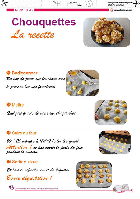 La recette de cette gourmandise qui se mange « avec les doigts », facile à élaborer, sera un moyen de la déguster à la suite d’une activité, en utilisant le « bar à chouquettes ». Cette recette au format 3D pour que chacun puisse suivre la recette à son rythme est assez facile.