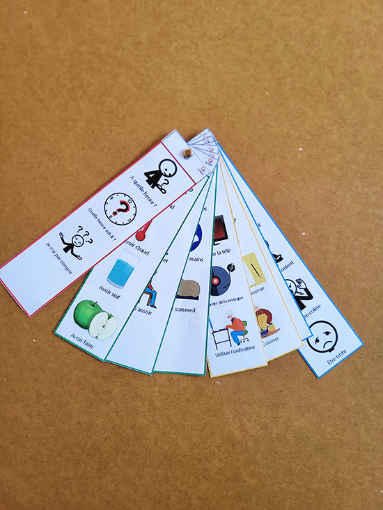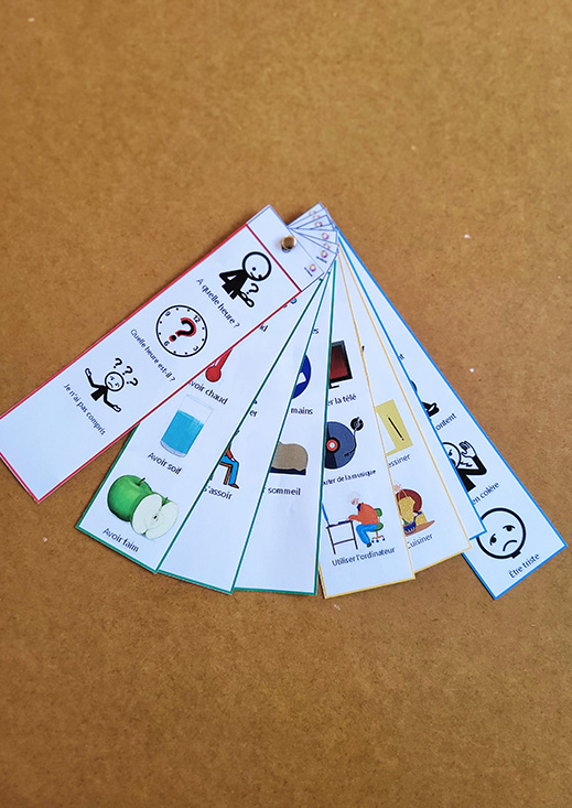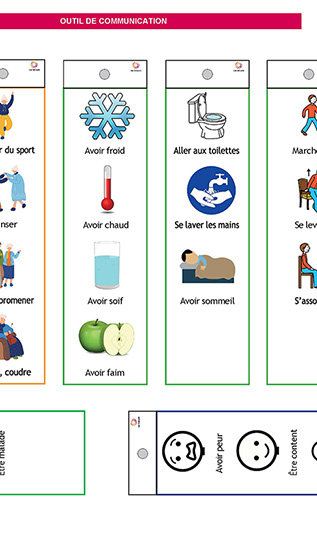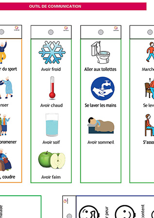Ce support permettra une meilleure interaction avec des personnes rencontrant des difficultés pour s’exprimer, telles que les personnes atteintes de déficience mentale ou ayant subi un AVC. Facile à assembler, il peut devenir très vite un outil indispensable dans les mains des résidents comme dans celles de l’équipe pluridisciplinaire.